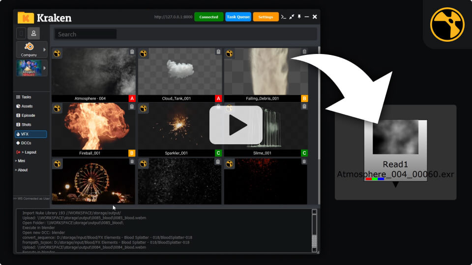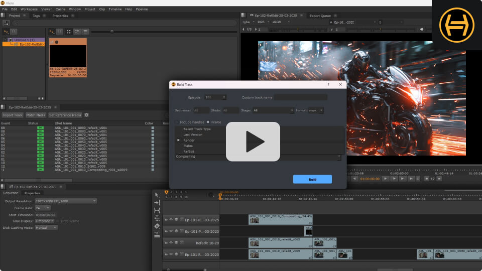 Desde Editorial se lanza la ingesta de clips, creando tareas, scripts de Nuke, escenas de Maya o procesos automáticos como Denoise o Tracking, para que los artistas encuentren todo listo para empezar.